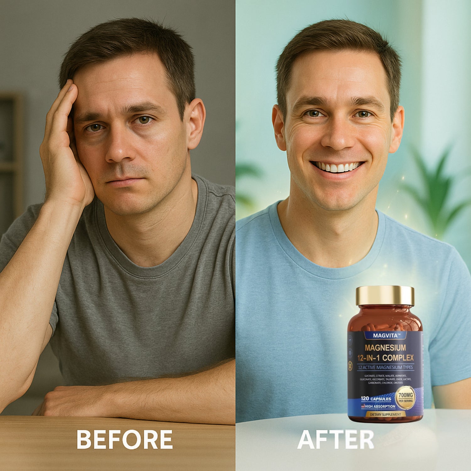 Unlock complete wellness with MagVita™ Magnesium 12-in-1 Complex, a powerful blend of twelve highly bioavailable magnesium forms designed to nourish your body from head to toe. Each serving delivers 700mg to support relaxation, muscle recovery, strong bones, energy production, heart health, and a balanced mood.